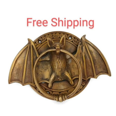 heavy cast Solid Brass bronze patina small heavy BAT Door Knocker 7″ handle pull wings ring bronze patina