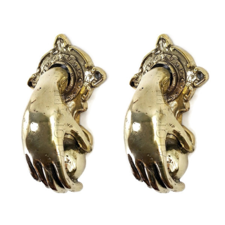 2 small hand fist ball front Door Knocker hand 6 ” inches long fingers solid pure brass hollow 11 cm vintage old style aged hinged pull banger