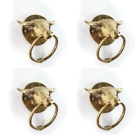 4 small bull buffalo head steer door handle solid brass old style horns ring 7 cm hook ring pull green oxidized seaside aged patina