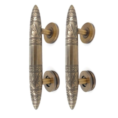 2 pieces small ENGRAVED pattern version NICE heavy brass 8” long torpedo shape D pull brass Door Handle old Vintage old Style grab pointy 20 cm
