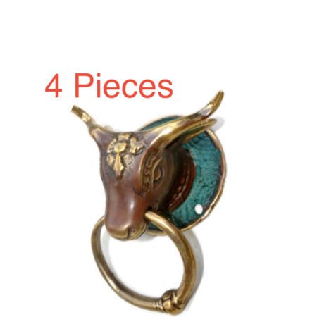 4 small bull head heavy Door handle solid brass vintage antique style ring 7 cm hook Bronze patina antique polished