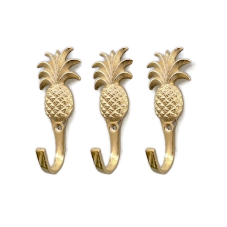 3 small PINEAPPLE brass HOOKS COAT wall mounted beach old style hook 10cm polished natural brass