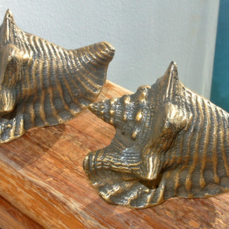 2 small SHELL FISH solid BRASS knobs tropical vintage old style 75 mm cabinet drawer pull grab kitchen sea side fish