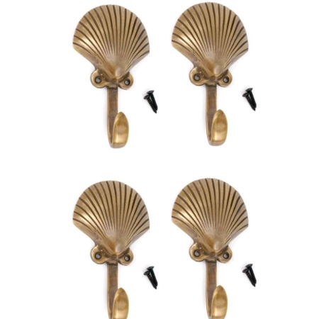 4 solid brass Small SHELL 12.5 cm Coat Hooks Polished Wall Mounted Old Style Beach hand cast 5″ inch seaside antique green scallop shell