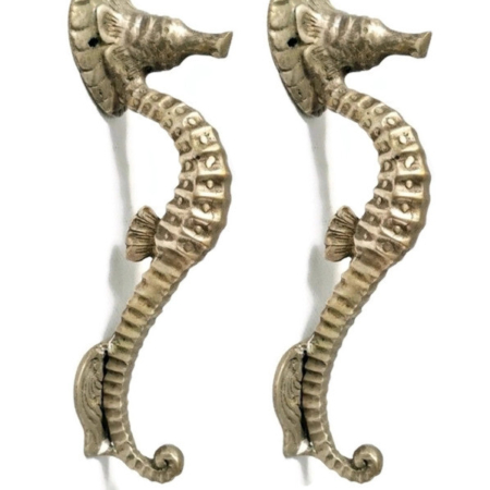 2 small SEAHORSE 25 cm solid 100% brass door aged seaside beach green oxidized patina old style house PULL handle 10″ outdoor