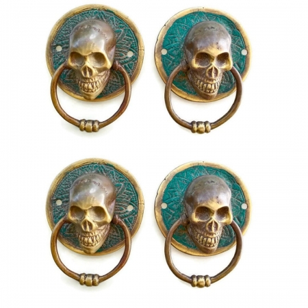 4 small round SKULL head ring pull Handle BRASS 7.5 cm day of the dead cabinet antique seaside beach patina green