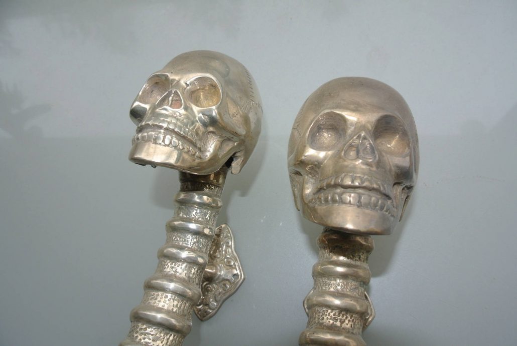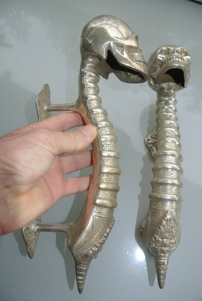 2 SKULL handle door pull spine pure brass old style silver plate 13″ long heavy