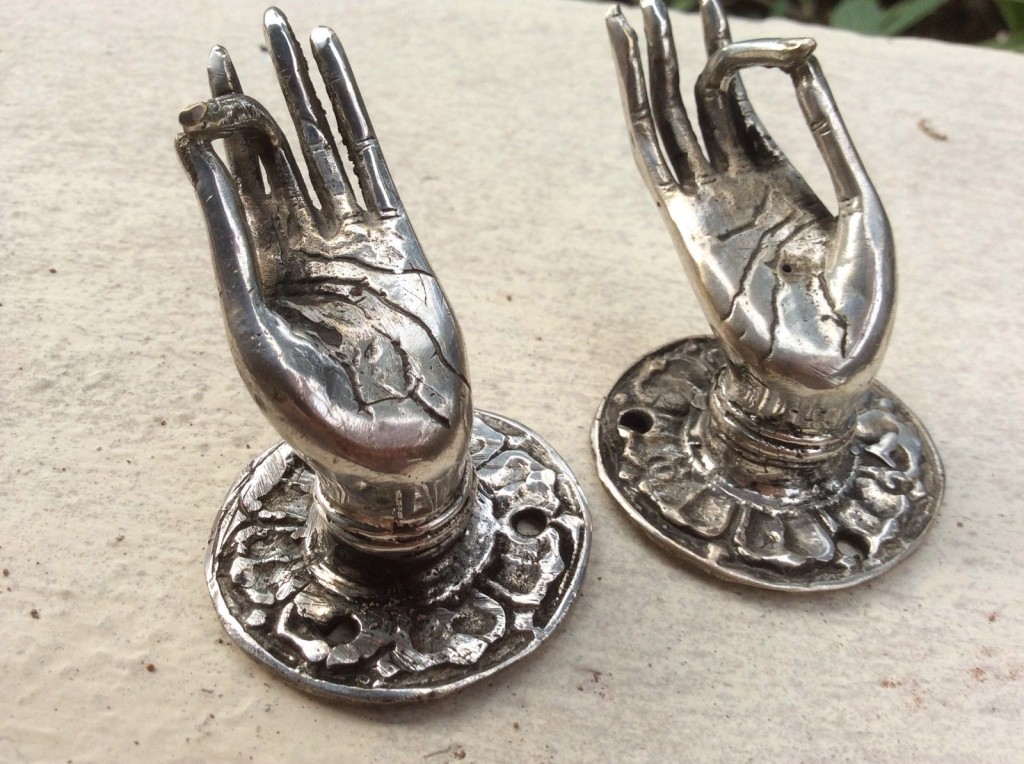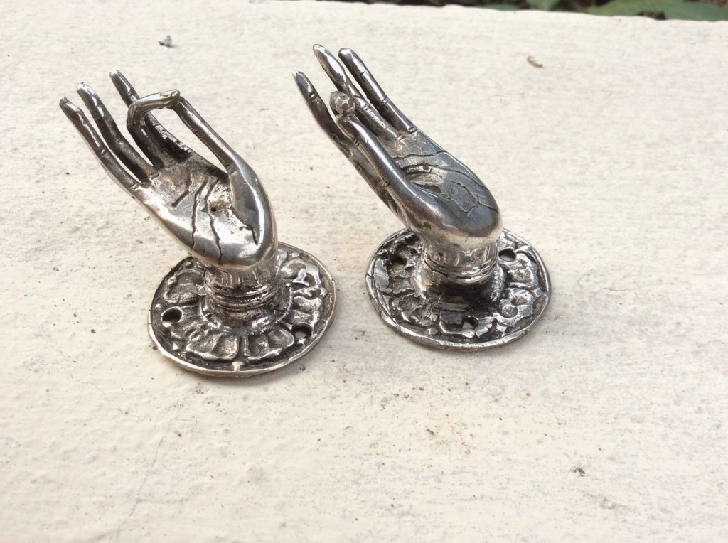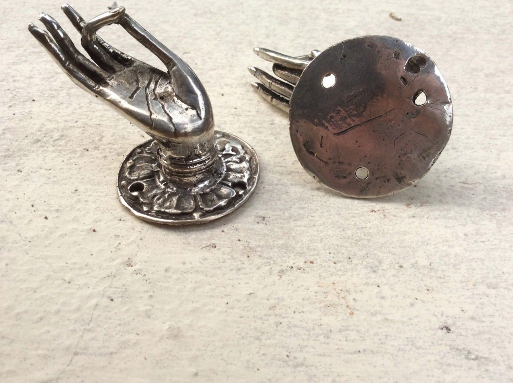 You are here: Home1 / Shop2 / BUDDHA GANESHA DEWI hooks handles pulls etc3 / 2 tiny small 4.5 cm cast Pull handle hands solid brass aged silver plated...