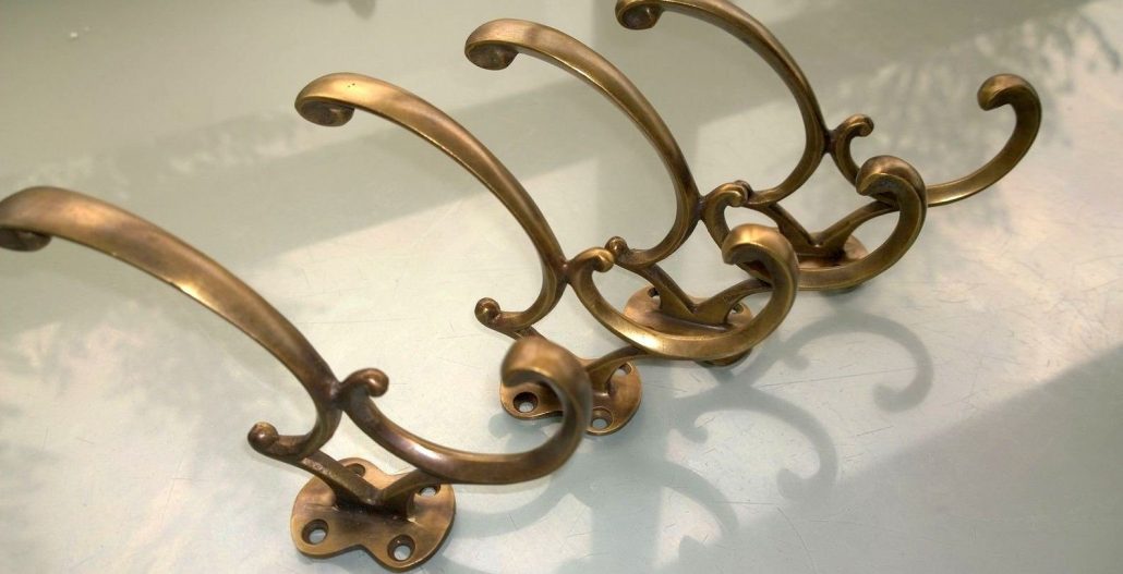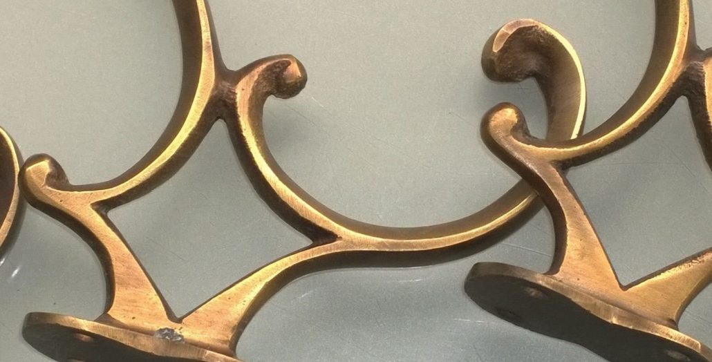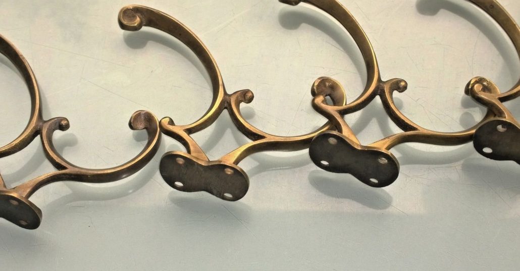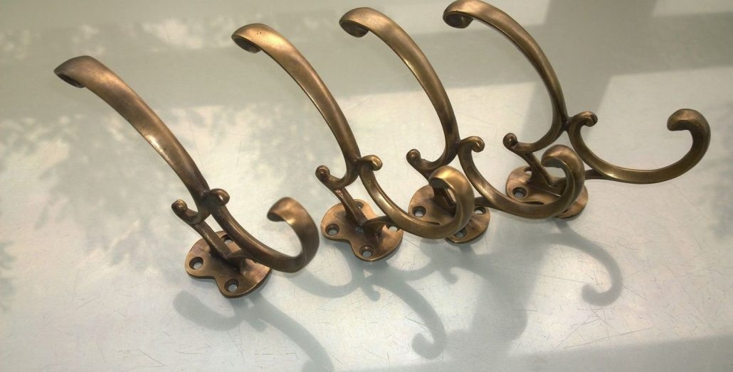 4 small COAT HOOKS door solid pure heavy brass furniture vintage polished old style DECO hand made cast vintage hall stand hanging heavy